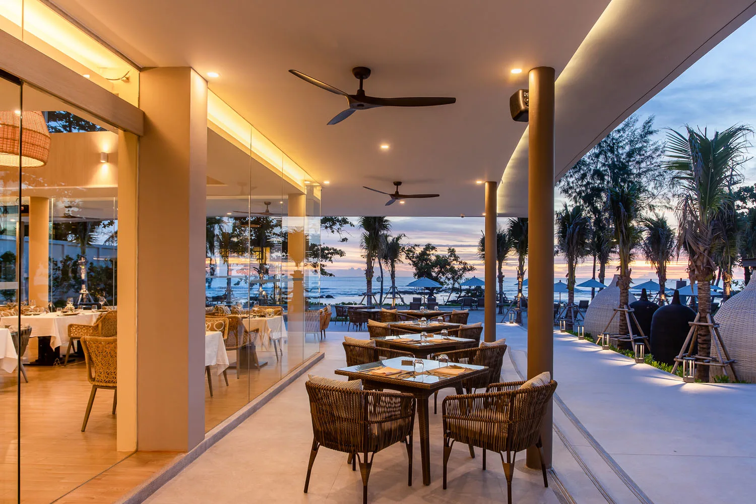 Our indoor air-conditioned dining room provides an intimate ambiance, perfect for those seeking a cozy evening experience. Alternatively, dine under the stars in our outdoor area, nestled right next to the beach. The decor here is inspired by tropical palms and coconut trees, creating a picturesque setting for a memorable dining experience.